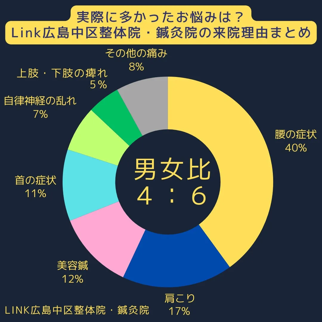 生活に支障が出るほどの慢性腰痛に悩まされている方は多く、痛みが長期間にわたって続く原因は人それぞれですが、我慢したり間違った方法を試したりすることで、より悪化してしまう恐れもあります。鍼灸と柔道整復師の国家資格を保有するスタッフが、お客様のお身体の状況をじっくりと確かめるカウンセリングを通して身体の不調を根本から見つめなおし、適切な施術を広島市でご提案しておりますので、ぜひ一度ご相談ください。